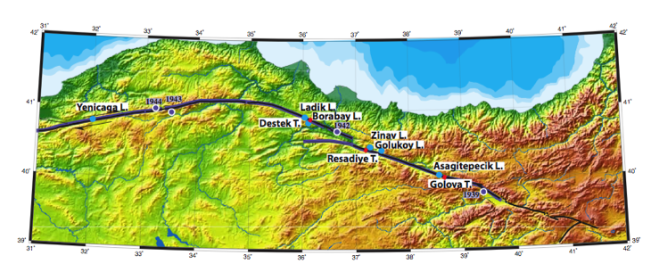 Figure caption - Blue dots: location of lakes studies (Yenicaga, Ladik, Borabay, Zinav, Golukoy, Asagitepecik). Red bars: trench sites (Destek, Resadiye, Golova). In violet, the rupture associated with M>7 earthquakes in 1939, 1942, 1943 and 1944.