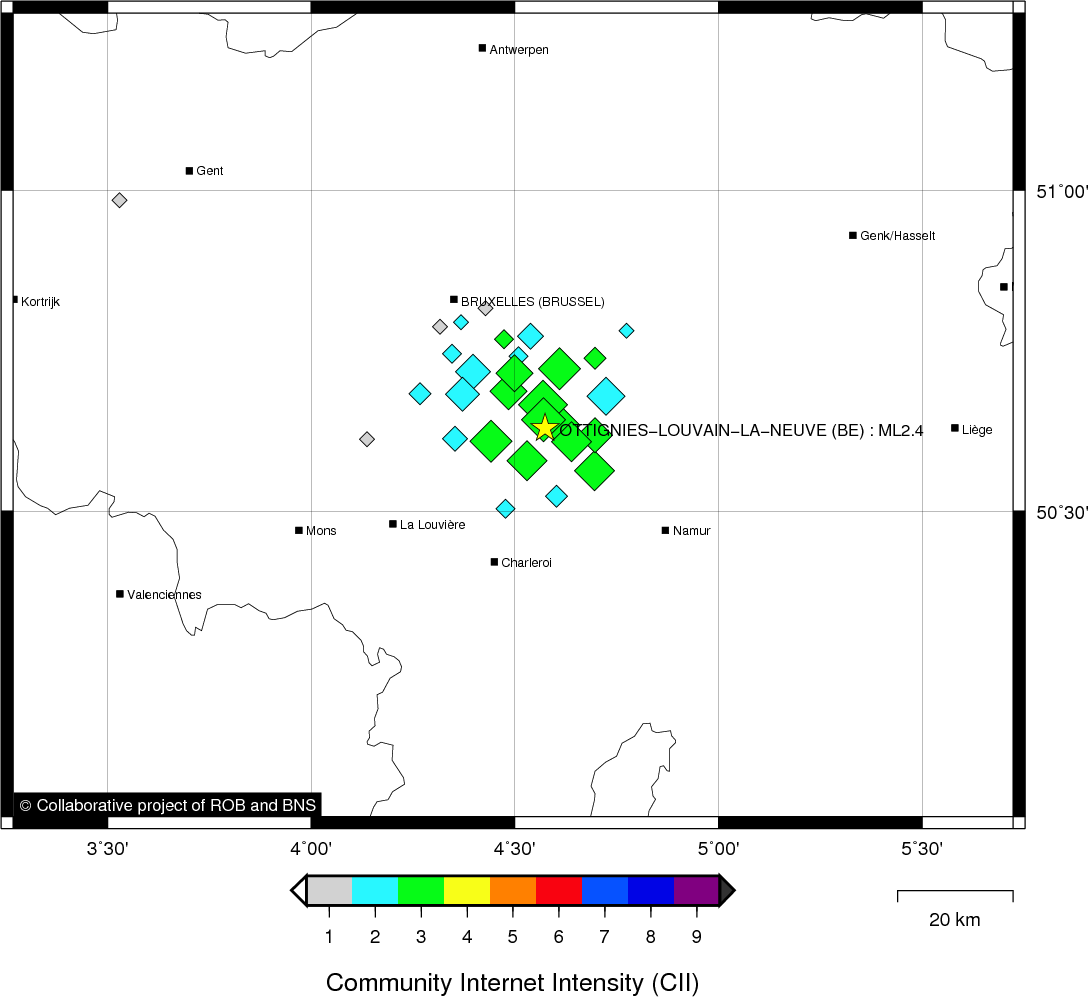Epicentral coordinates 50.630° N, 4.574° E Uncertainty ± 1.0 km