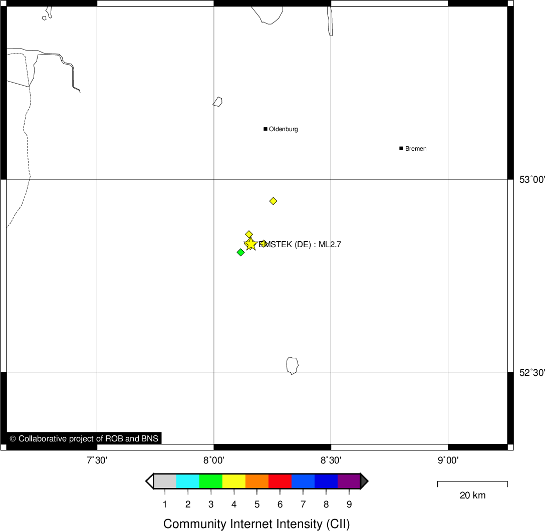 Epicentral coordinates 52.833° N, 8.158° E Uncertainty ± 10.0 km