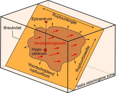• L et W: la longueur et la largeur de la zone de rupture, la partie de la faille qui s'est déplacée durant le séisme. (« la largeur » est la distance mesurée le long de la pente de la faille et la longueur est mesurée transversalement);