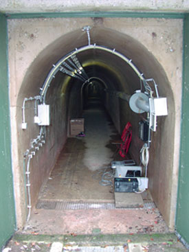 Figure 10: Entrée de la galerie creusée dans la colline à Membach, non loin du lac de la Gileppe. Au bout de ce couloir long de 130m, se trouvent les salles de mesure où sont installés plusieurs sismomètres ainsi qu'un gravimètre à supraconductivité. Au début du couloir on voit l'accéléromètre, installé en 2003.