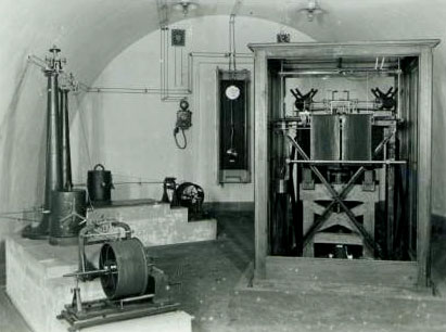Figure 4: La cave sismique à Uccle vers 1912. À gauche, les deux sismomètres horizontaux lourds "Bosch-Omori" installés en 1906. Actuellement, on trouve à leur place les sismomètres de Galitzine et de Sprengnether/Press-Ewing. Á droite, le sismomètre Wiechert horizontal, avec, à l'avant, les rouleaux de papier noirci grattés par une plume et destinés à l'enregistrement des mouvements du sol dans les directions E-W et N-S. Le sismomètre Wiechert vertical n'est pas sur cette photo. À gauche une horloge Splinder-Hoyer, installée à la même époque pour indiquer le temps sur les séismogrammes.