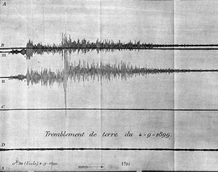 En 1911, la station sera dotée de 2 pendules horizontaux Galitzine (Figure 5) munis du premier dispositif électromagnétique mis au point pour l'enregistrement des séismes, à la base de tous les systèmes modernes. Pendant la première guerre mondiale, faute de papier photosensible, on ne poursuivra que l'enregistrement mécanique des sismomètres Wiechert. Les autres ne reprendront que le 12 juillet 1919.