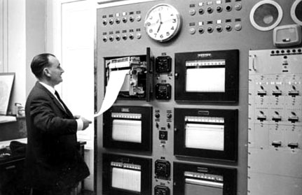 Figure 7: J.-M. Van Gils, en 1966, devant la "cabine de la sismologie" de l'O.R.B., où ont été effectués les enregistrements des sismomètres Wiechert de 1962 à 1970 et, ensuite, Sprengnether/Press-Ewing jusqu'en 1985. Les six enregistreurs permettaient d'enregistrer sans interruption pendant les changements de rouleaux les trois composantes Est-Ouest, Nord-Sud et Verticale du sismomètre.