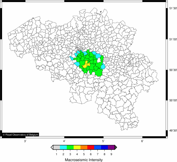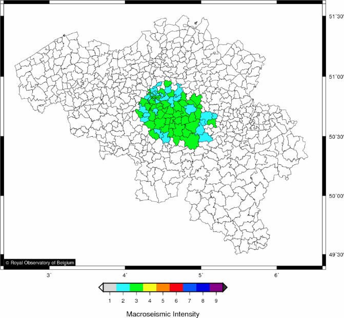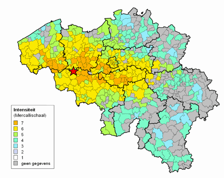 Depuis 1932, suite au séisme d'Uden (Pays-Bas) de magnitude ML 4.7, dès qu’un séisme ressenti se produit, l’Observatoire Royal de Belgique envoie un questionnaire à chaque commune belge afin d’établir une carte d’intensité de la zone où le séisme a été ressenti. En fonction des réponses, une intensité sismique est donnée à chaque commune, ce qui donne une carte des intensités macroséismiques communales. Somville (1939) appliqua la méthode avec succès en Belgique suite au séisme de magnitude Ms 5.0 de Zulzeke-Nukerke qui frappa la région d’Audenarde le 11 juin 1938, et qui reste le tremblement de terre le plus important jamais enregistré par des instruments sur le territoire belge. Il est remarquable de noter que la zone des dégâts a une forme elliptique : dans la direction E-W les intensités macroséismiques VI et VII se retrouvent sur une zone s’étendant sur 160 km, tandis que dans la direction N-S, la zone ne s’étend que sur 50 km (Figure 1). Cette forme particulière a été déduite de l’étude statistique des chutes de cheminées.