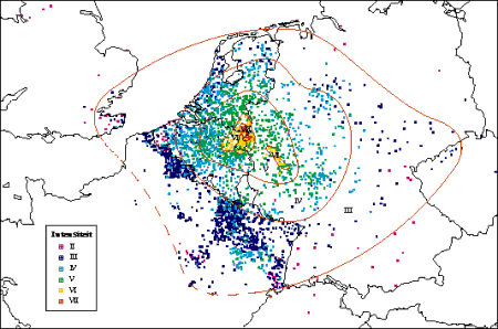 Figure 2: Carte macroséismique transfrontalière du séisme de Roermond de 1992 de magnitude Ms 5.4 (Haak et al. 1994). L’intensité VII s’observe dans la zone épicentrale.