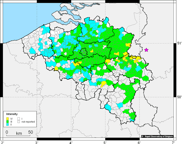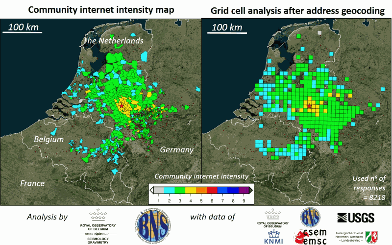 En 2011, l’Université de Cologne (Erdbebenstation Bensberg BNS) a rejoint notre système d’enquête par internet. Depuis lors, les citoyens allemands peuvent faire part de leur expérience au réseau BNS et sur base des réponses, une carte macrosismique germano-belge est générée en temps réel. Cette collaboration macrosismique transfrontalière est unique dans le monde !