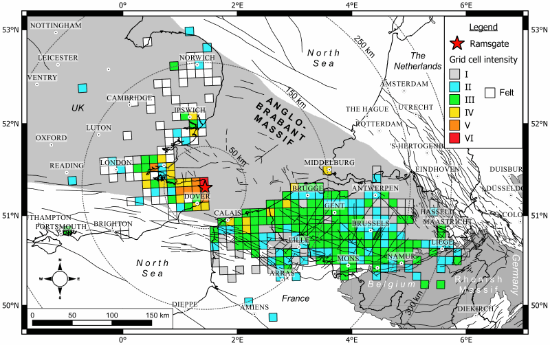 Le vendredi 22 mai 2015 à 03:52:17 (temps local), un séisme de magnitude ML 4.2 s’est produit près de Ramsgate (UK) à une profondeur de 15 km. Les enquêtes macrosismiques ont montré que le séisme fut ressenti au Royaume-Uni, en France et en Belgique. L’ORB a reçu 1986 réponses de personnes ayant ressenti le séisme en Belgique ; le rapport le plus éloigné provient de Liège, à plus de 400 km de l’épicentre. Comme pour les séismes de Goch de 2001 ou de Zulzeke-Nukerke de 1938, la faible profondeur du Massif du Brabant en moyenne Belgique est la raison principale pour laquelle l’événement fut si largement ressenti.