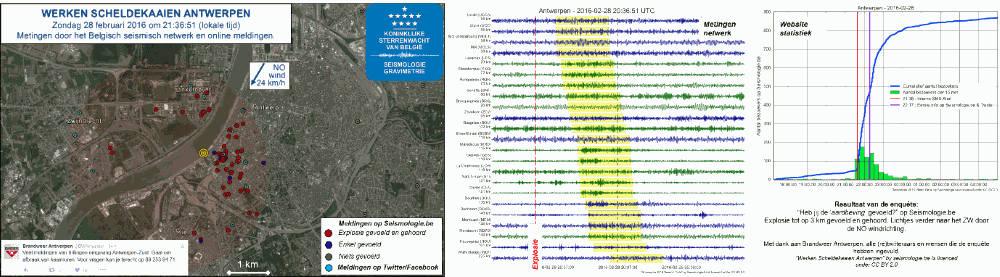 Le dimanche 28 février 2016 à 21:36:51 (temps local), l’explosion contrôlée liée à un chantier de construction à Anvers fit croire à la population qu’un séisme s’était produit. Le système Seismologie.be a été mis en alerte en raison du nombre anormalement élevé de visiteurs sur le site web et le compte Twitter. Une analyse rapide des données sismiques pu confirmer l’absence de tremblement de terre ; cette information a été promptement relayée sur les comptes Twitter et Facebook. 54 personnes ont témoigné de leur ressenti sur Seismologie.be. La distribution des témoignages montrent que cet événement a été ressenti/entendu vers le sud-ouest, en raison du vent du nord-est qui soufflait ce soir-là.