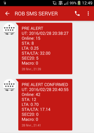 The automatic reporting of detected earthquakes is, for the moment, only disseminated internally to the ROB scientists and staff in charge. Whenever an earthquake is detected, it is reviewed by a seismologist in a very short time. When absent from official duty service, this time could be a little longer during the night or weekends, because it requires seismologists to hear their SMS alerts, connect to the ROB servers and process the data in order to issue the information on the official website. Still, in the recent years, the time span between the occurrence of a felt earthquake and its online publication never surpassed 20 minutes.